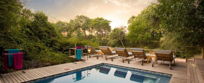 The comfortable lounge area is an ideal place for idle game viewing or relaxing with a good book and a cool drink between guided activities. Books are available from the library and drinks can be purchased from the bar. At meal times the dining area is the perfect location for enjoying sumptuous meals whilst absorbing the sights and sounds of the African bush. The wooden deck extends past the adjacent chemical-free swimming pool which allows guests to cool off in the heat of the day without missing the wildlife and birdlife that frequent the waterhole.