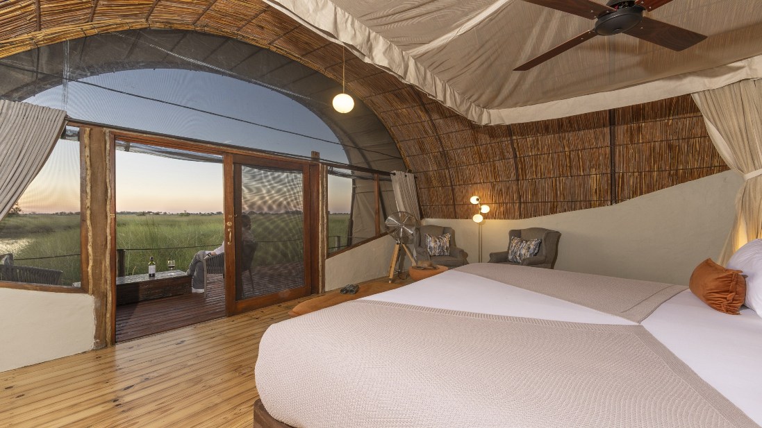 Okuti comprises of five very spacious twin and double-bedded “Masasas” (ancient tribal word for house of reeds), exceptionally unique in style and architecture all rooms overlook the permanent Maunachira channel. An additional two family “Masasas” consist of two bedrooms which share spacious bathroom facilities – ideal for families in this child friendly camp. Each en-suite bathroom provides both an indoor and outdoor shower. Connected by raised wooden walkways all areas of camp are wheelchair accessible.