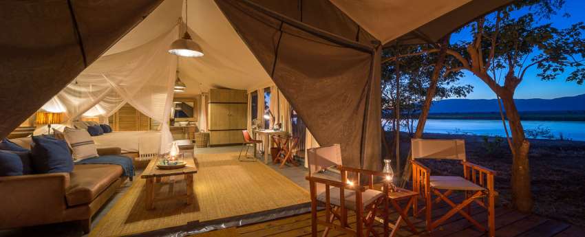 Ten spacious and beautifully decorated en-suite tents, including two family rooms, lie beneath the ana trees, best-beloved of local elephant for their nutritious seeds. The camp's central living space includes an inviting firepit for pleasant evenings beneath the African night skies. Other unique features include a pool which overlooks a broad sweep of river, an outdoor “bath with a view” in a secluded, scenic spot, and a romantic Star Bed by a busy waterhole.